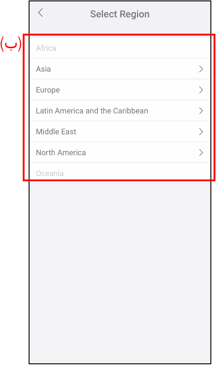 تنتقل الشاشة إلى "Select Country/Region"، ويتم عرض قائمة بالبلدان/المناطق في المنطقة المحددة.