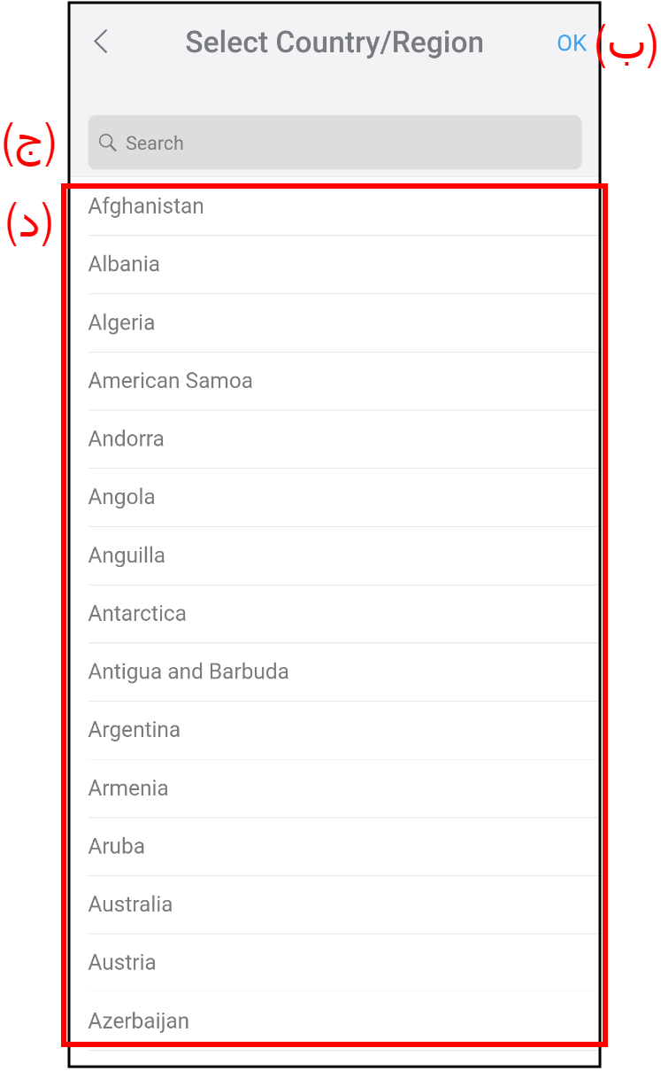 - حدد بلدك/منطقتك من القائمة (د). يمكنك البحث عن البلد أو المنطقة من "Search" (ج).