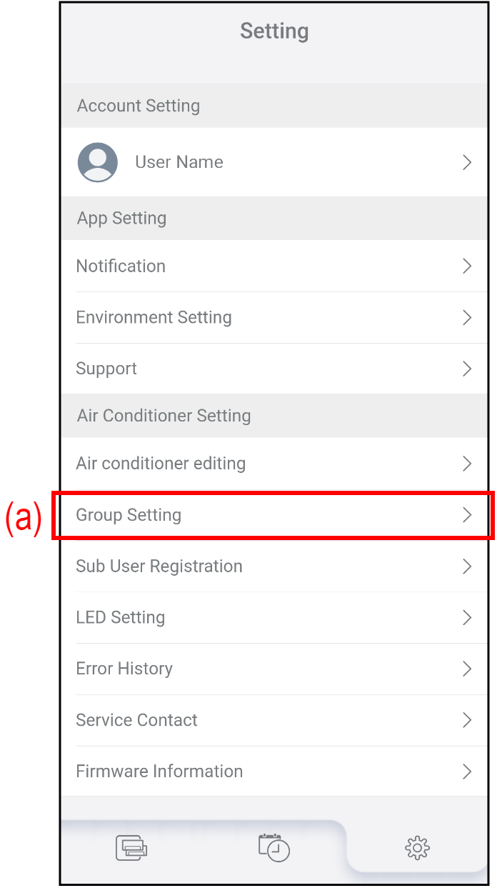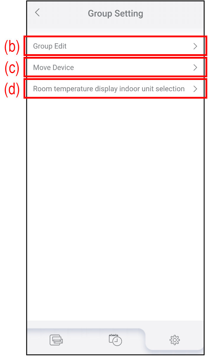 (b) Group Edit Докоснете, за да създадете нова група, да редактирате името на групата или да изтриете групата. Вижте „Group editing (Редактиране на група)“ за подробности. (c) Move Device Докоснете, за да преместите климатика в друга група.