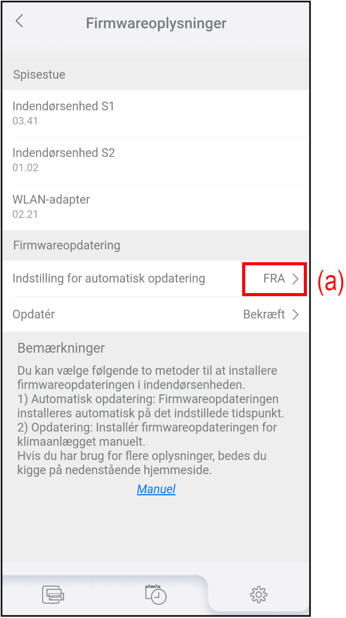 Du kan indstille tidspunktet for start af den automatiske firmwareopdatering for klimaanlægget og WLAN-adapteren.