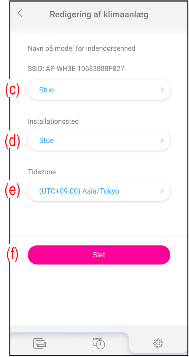 (Kontroltilstanden kan ændres i "Environment setting (Miljøindstilling)".)(d) Installationssted Tryk for at vælge installationsplaceringen for klimaanlægget. (e) Tidszone Tryk for at vælge den tidszone, hvor klimaanlægget installeres. Den ugentlige timer og udendørsenhedens lav-støj-timer fungerer i henhold til denne indstilling. (f) Knappen [Slet] Tryk for at slette det registrerede klimaanlæg fra din konto. Hvis du trykker på denne knap, vises en bekræftelsesmeddelelse.