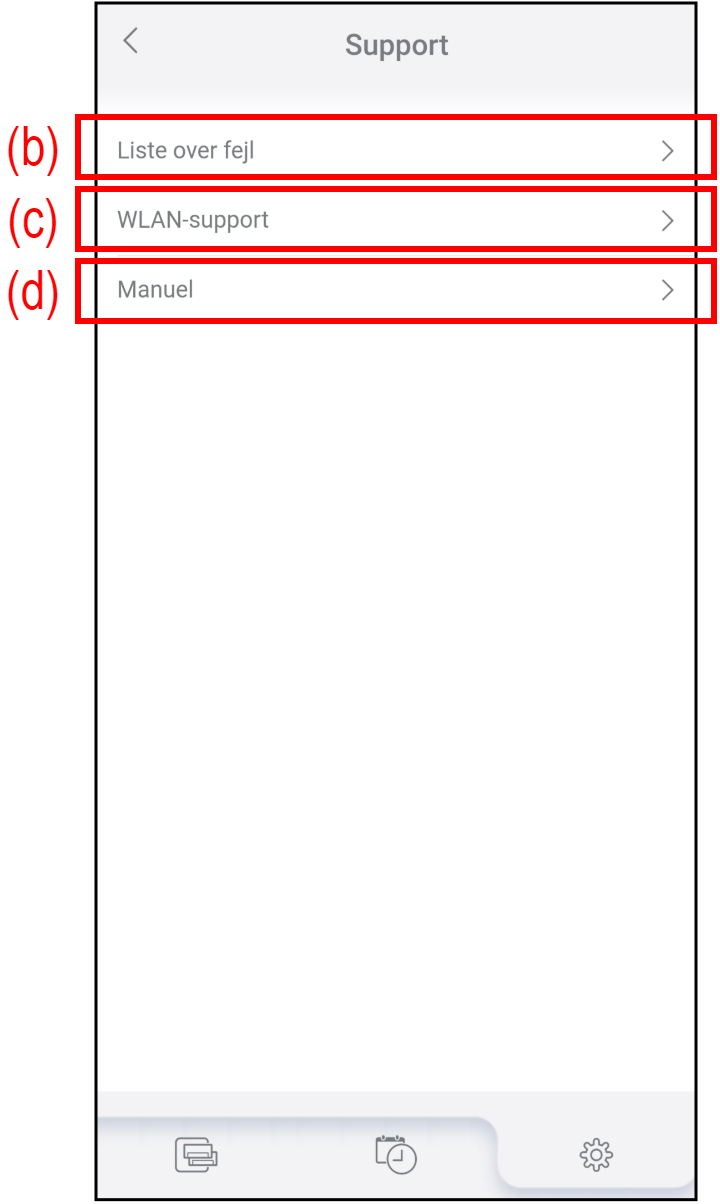 Tryk på (a) på skærmen "Indstilling" for at tjekke supportoplysninger.