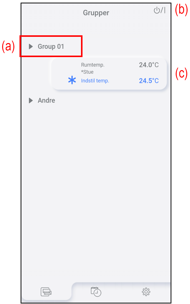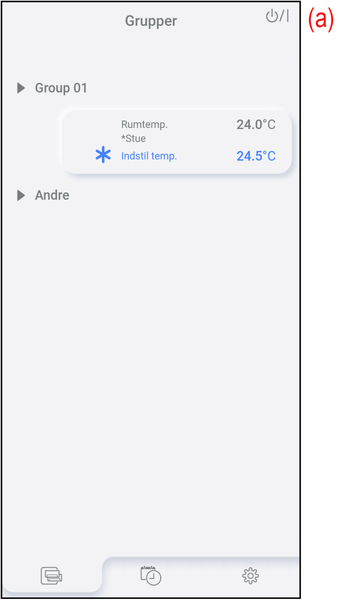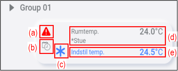 | (d) | Rumtemp. | Det viser den repræsentative indendørsenhed og rummets temperatur målt af den repræsentative indendørsenhed. Du kan indstille den repræsentative indendørsenhed fra fanen Indstillinger > "Gruppeindstilling" > "Valg af visning af rumtemperatur på indendørsenhed". |