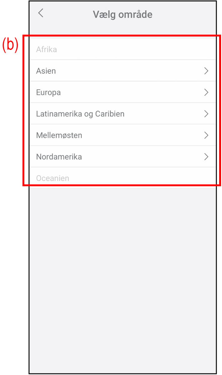 Skærmen flytter til "Vælg land/område," og der vises en liste over lande/regioner i den valgte region.