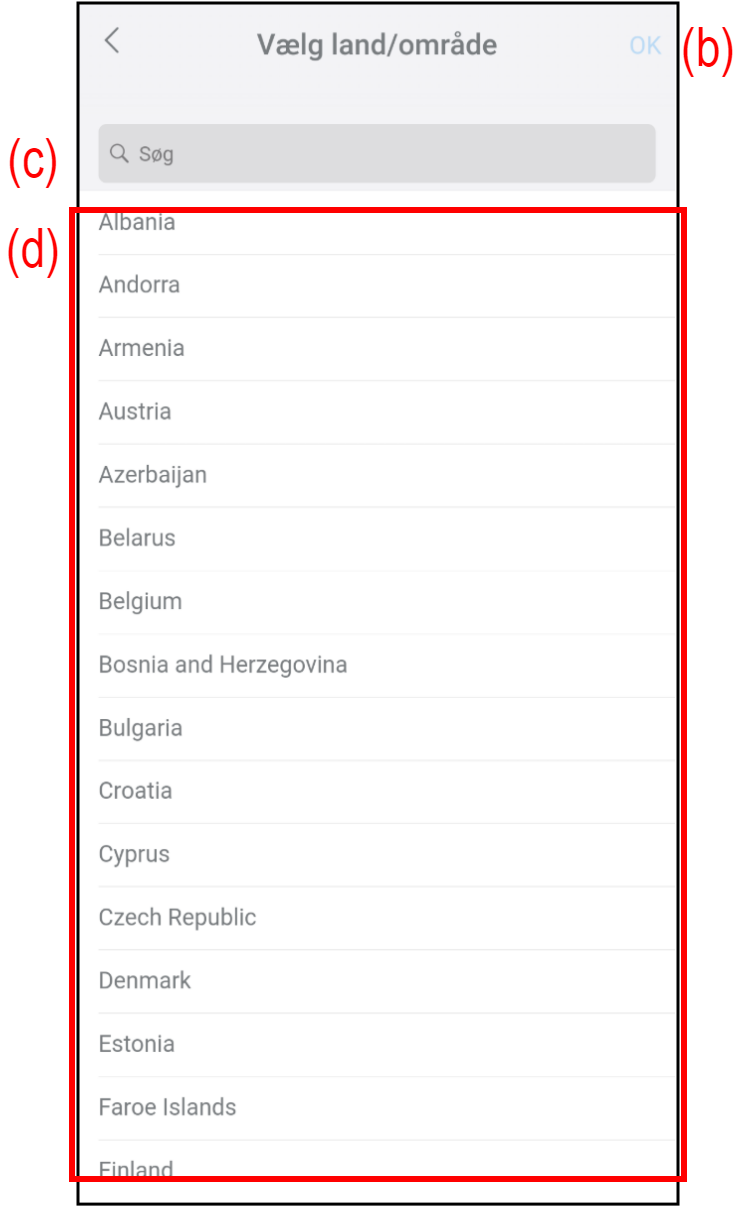 - Vælg dit land/din region fra listen (d). Du kan søge efter land/region fra "Søg" (c).
