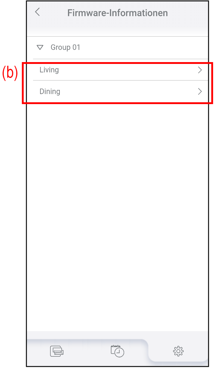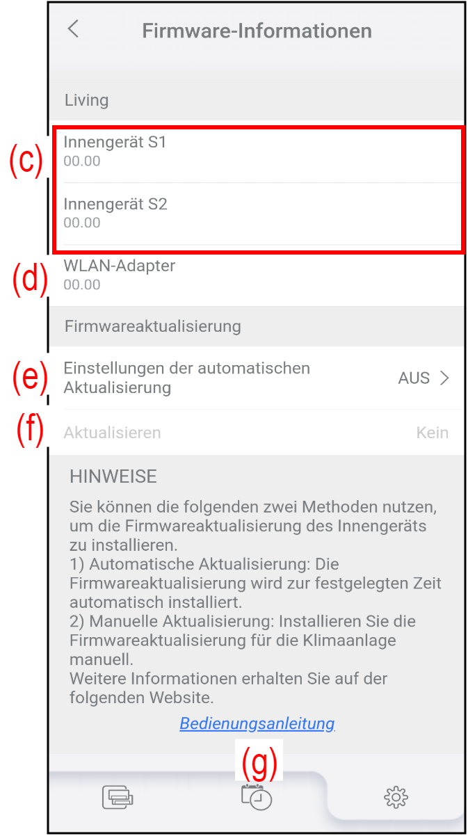Einzelheiten siehe „Festlegen des Aktualisierungszeitpunkts für die Firmware“.(f) Aktualisieren Tippen Sie, um die Firmware der Klimaanlage oder des WLAN-Adapters manuell zu aktualisieren.
