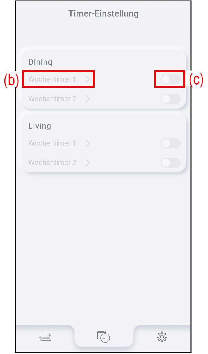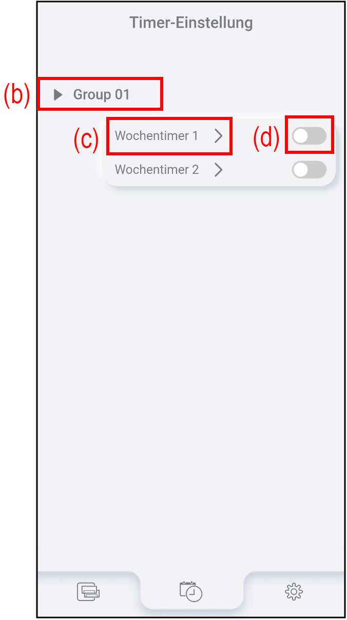Tippen Sie auf (b), um die Wochentimer-Einstellungen zu prüfen oder zu bearbeiten. Einzelheiten siehe „Timer-Einstellung“.