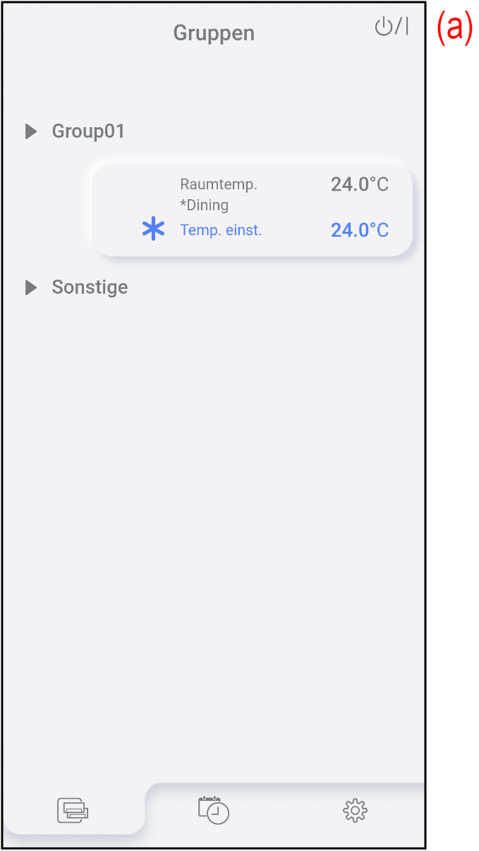 | (c) | Aktueller Status | Zeigt den aktuellen Status der Gruppe an. Um alle Klimaanlagen in der Gruppe zu bedienen, tippen Sie hier. Näheres dazu siehe „Betriebseinstellung für die Gruppe“.  |