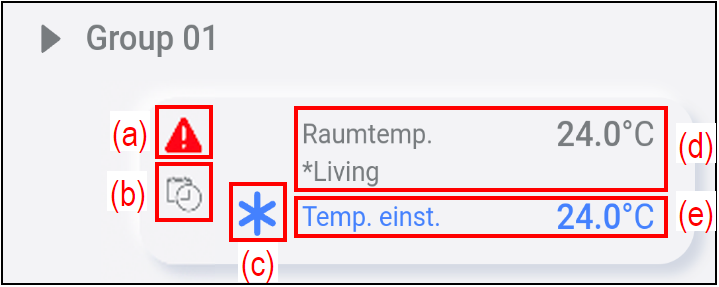 | (d) | Raumtemp. | Zeigt das repräsentative Innengerät und die von dem repräsentativen Innengerät gemessene Raumtemperatur. Sie können das repräsentative Innengerät über die Einstellungen-Registerkarte > „Gruppeneinstellung“ > „Auswahl der Raumtemperaturanzeige des Innengeräts“ einstellen.  |