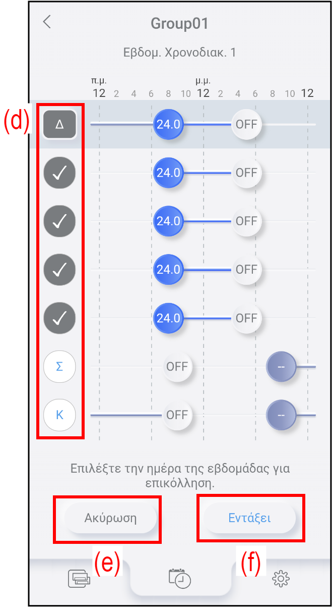 - Πατήστε (a) στην οθόνη Ρυθμίσεις εβδομαδιαίου χρονοδιακόπτη.