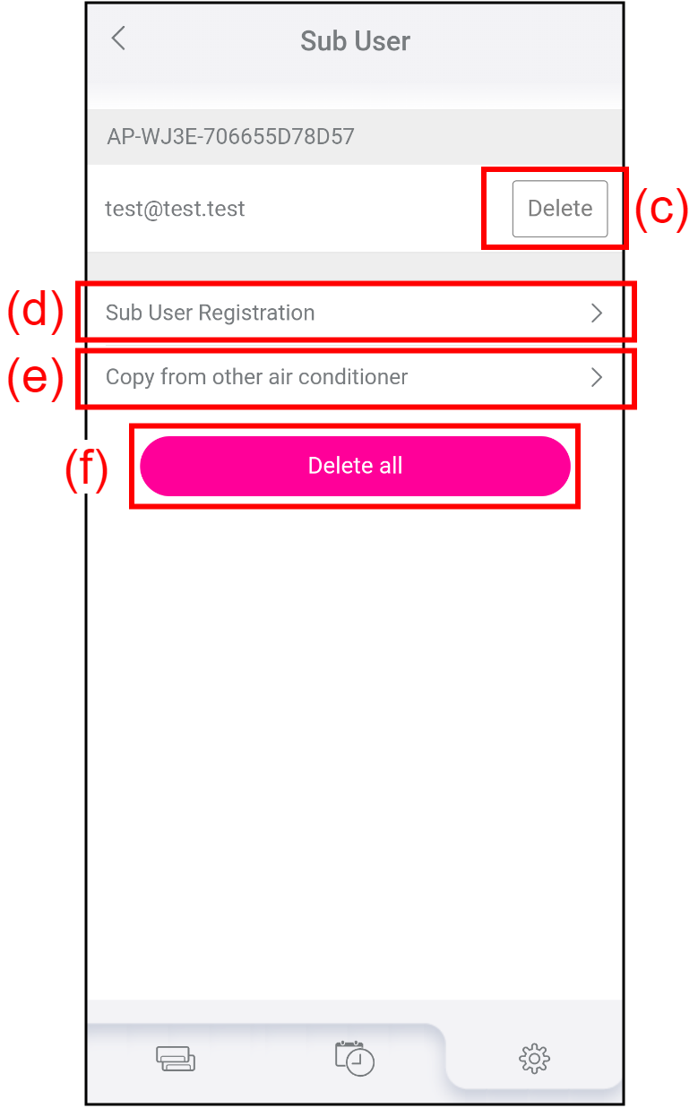 To copy the settings of the sub-user from another air conditioner to this air conditioner, tap (e). Refer to "Copying the sub-user settings from another air conditioner."