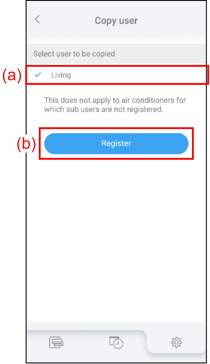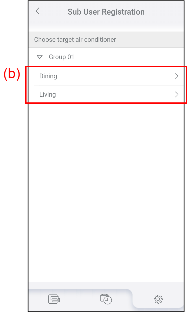 Tap (b) to select the air conditioner to which you want to add or delete the sub-user.