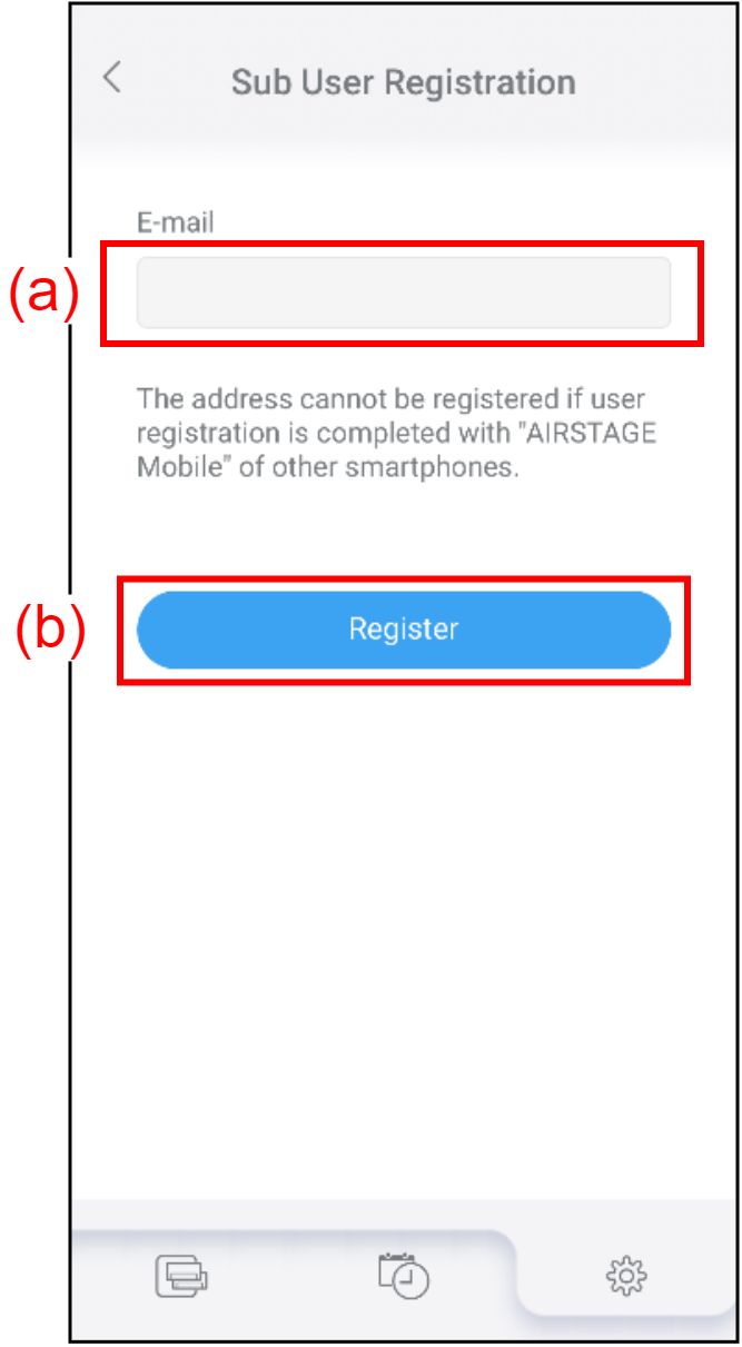 - Enter the e-mail address of the sub-user to (a) on the "Sub User Registration" screen.
