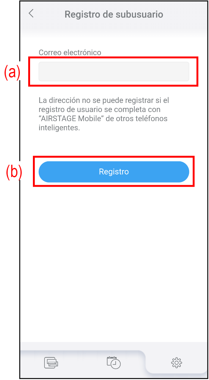 * La dirección de correo electrónico debe ser una cuenta válida de AIRSTAGE Mobile. Asegúrese de instalar AIRSTAGE Mobile y completar la creación de la cuenta con el smartphone del subusuario previamente.