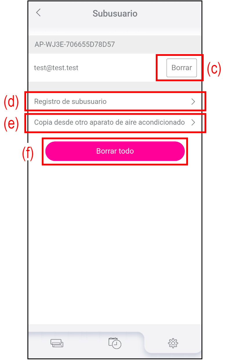 Para eliminar todos los subusuarios registrados en el aire acondicionado, toque (f).