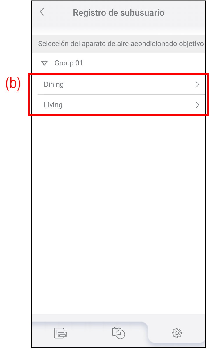 Toque (b) para seleccionar el aire acondicionado en el que desea añadir o eliminar el subusuario.
