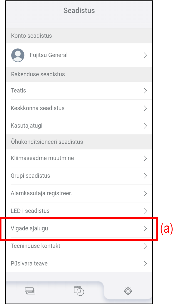 - Tõrgete ajaloo kontrollimiseks puudutage ekraanil „Seadistus“ (a).