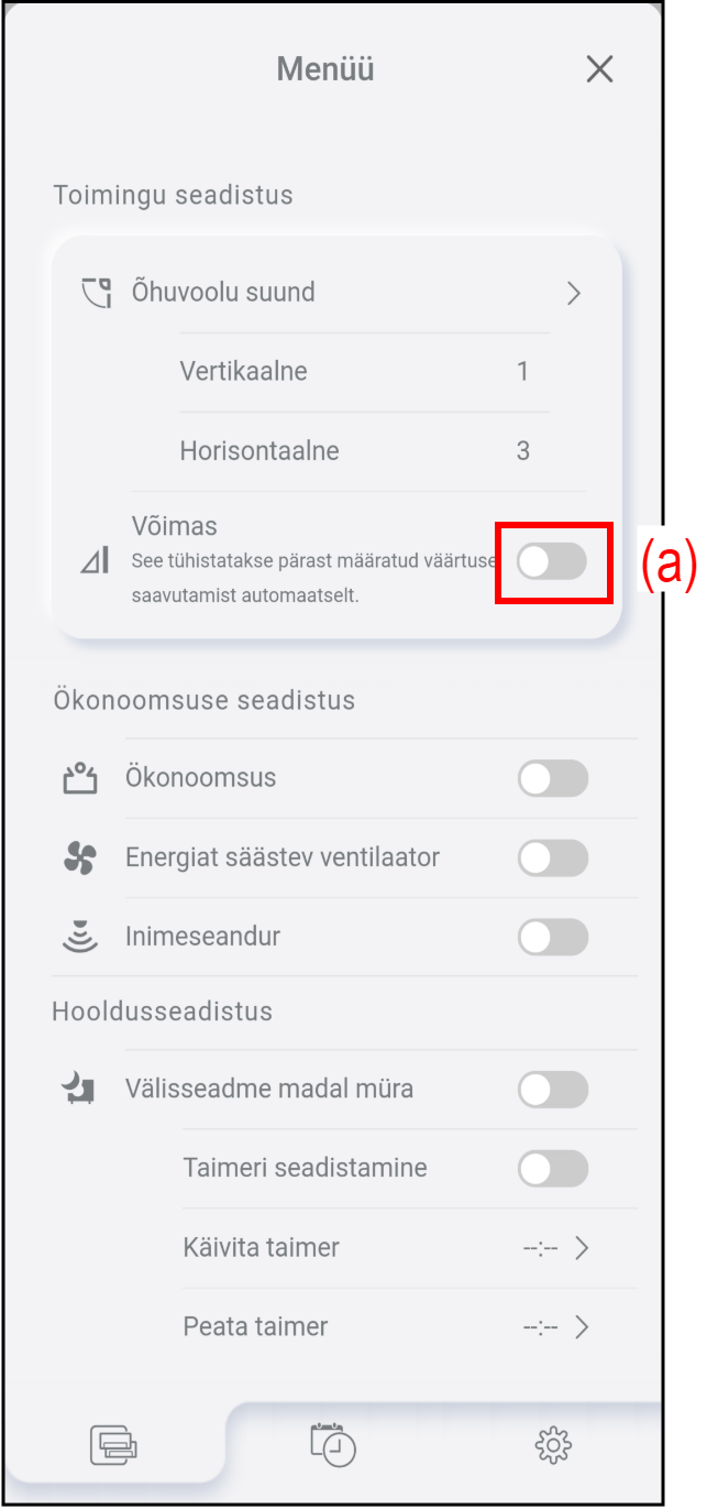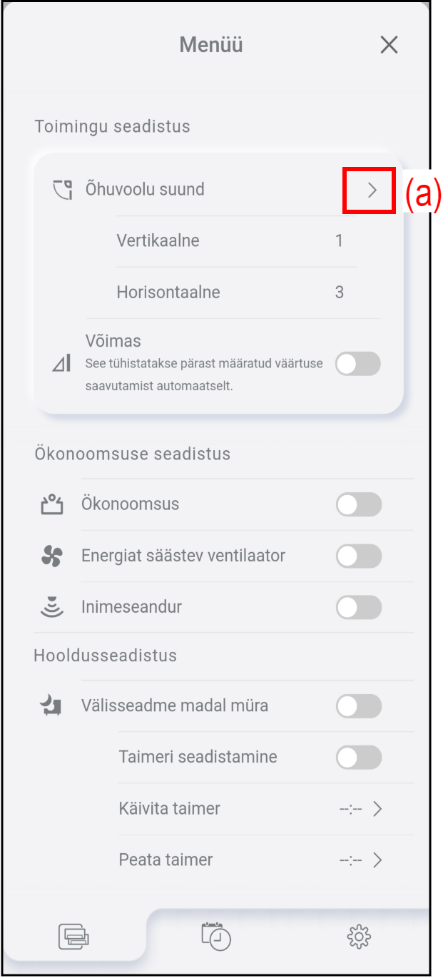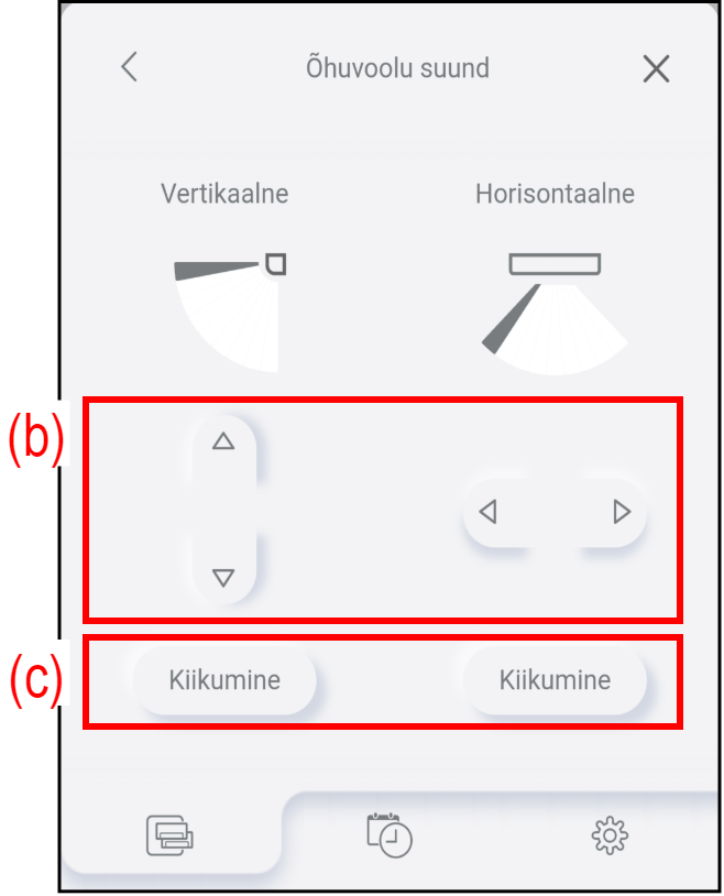 Puudutage (a), et reguleerida üles/alla või vasakule/paremale õhuvoolu suunda.