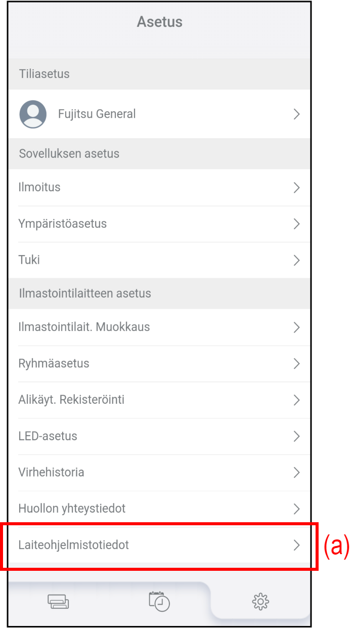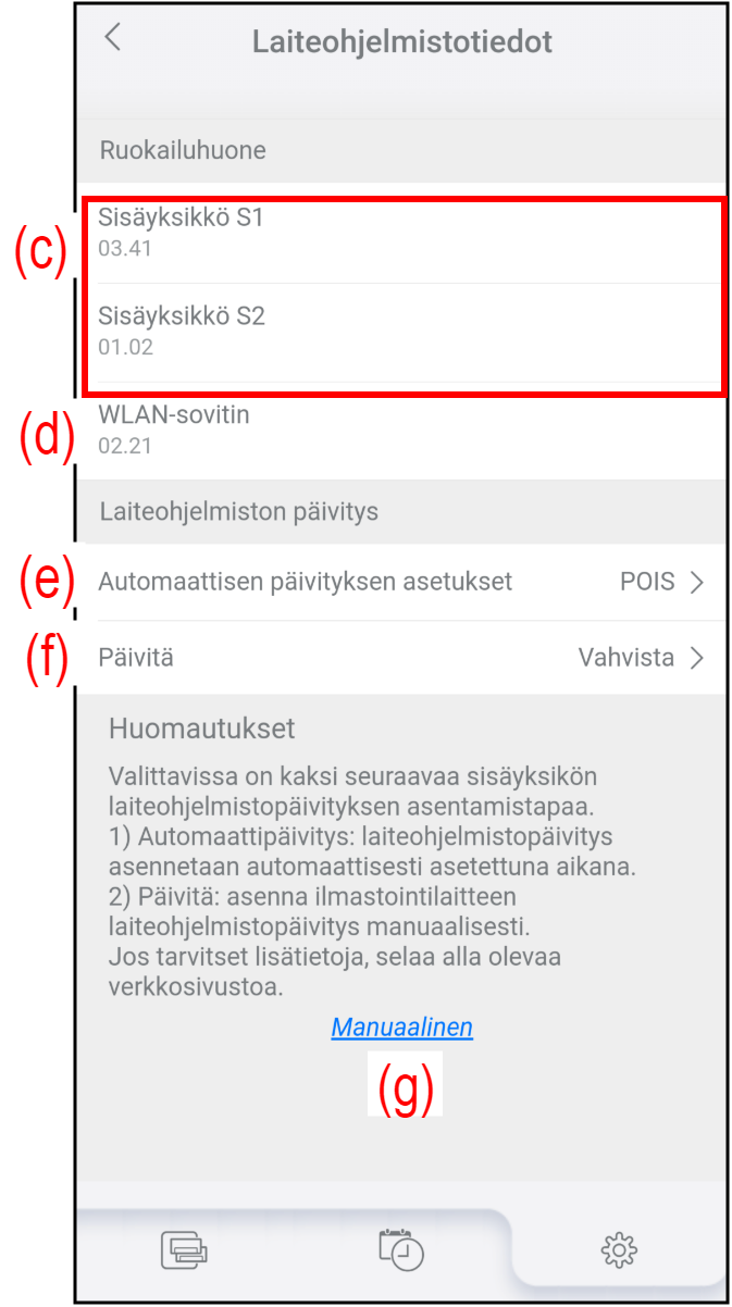 Katso lisätietoja kohdasta ”Laiteohjelmistopäivityksen aikataulun asettaminen”.(f) Päivitä Päivitä ilmastointilaitteen tai WLAN-sovittimen laiteohjelmisto manuaalisesti.