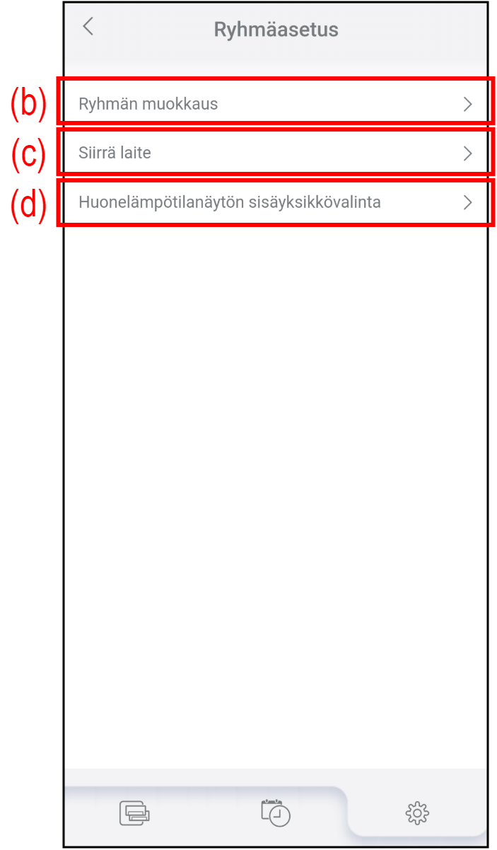 (b) Ryhmän muokkaus Luo uusi ryhmä, muokkaa ryhmän nimeä tai poista ryhmä napauttamalla. Katso lisätietoja kohdasta ”Group editing (Ryhmän muokkaaminen)”. (c) Siirrä laite Siirrä ilmastointilaite toiseen ryhmään napauttamalla.