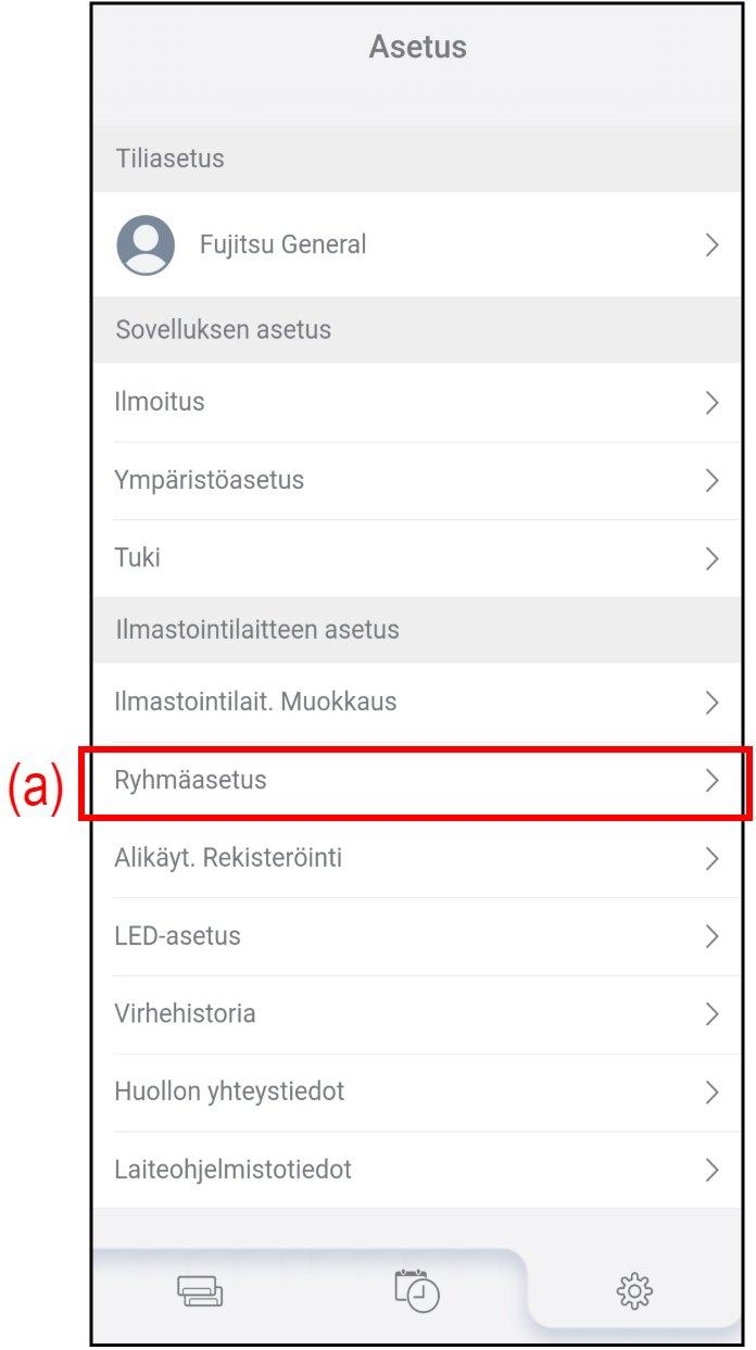 - Napauta kohtaa (a) ”Asetus”-näytössä tarkistaaksesi tai muokataksesi ryhmäasetuksia.