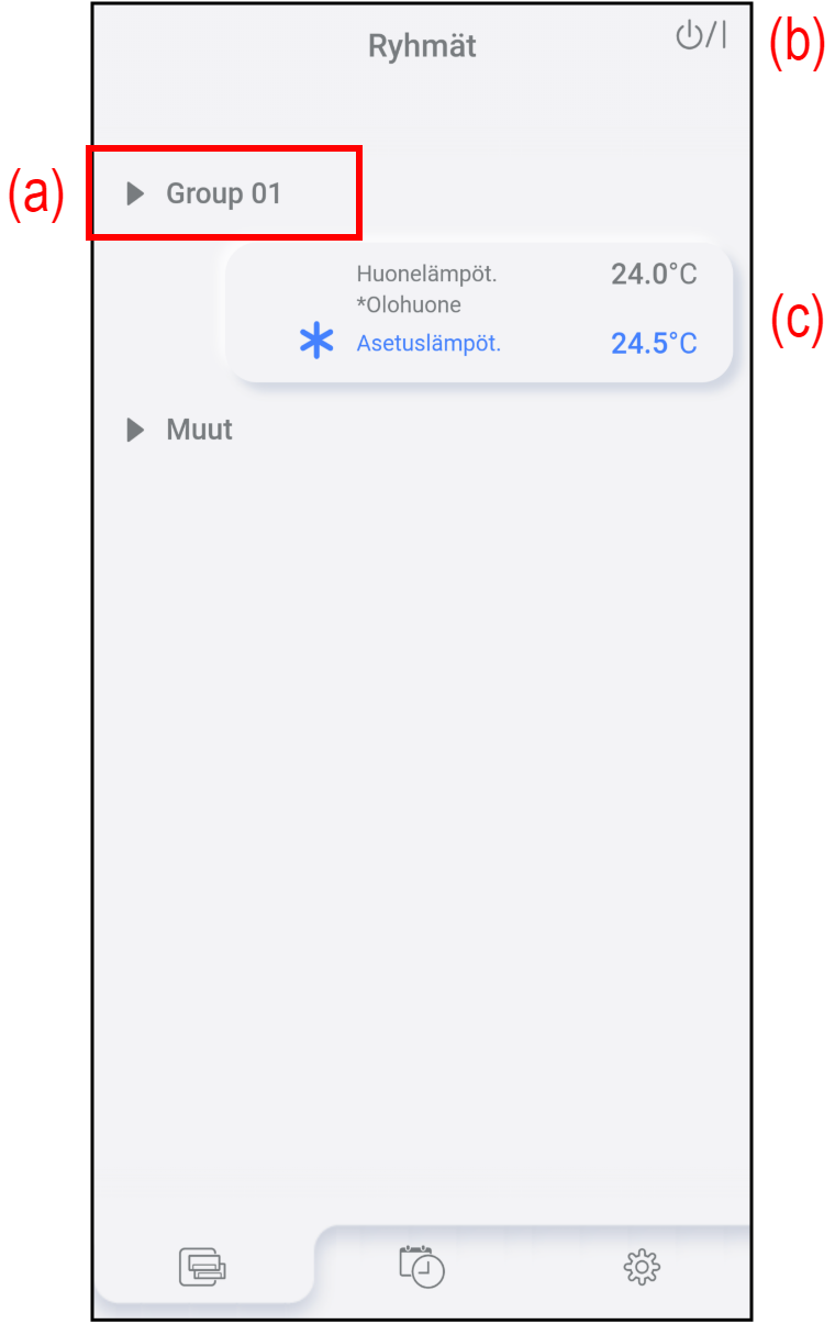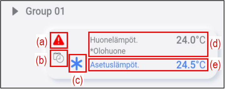 | (d) | Huonelämpöt. | Näyttää ensisijaisen sisäyksikön ja huonelämpötilan, jonka ensisijainen sisäyksikkö mittaa. Voit asettaa ensisijaisen sisäyksikön Asetukset-välilehti-välilehdestä > ”Ryhmäasetus” > ”Huonelämpötilanäytön sisäyksikkövalinta”. |