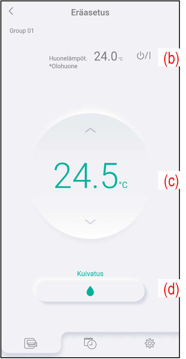 (b) Aloitus/Lopetus Aloita/lopeta toiminta napauttamalla tästä. (c) Aseta lämpötila Muuta lämpötila-asetusta napauttamalla kohtaa [