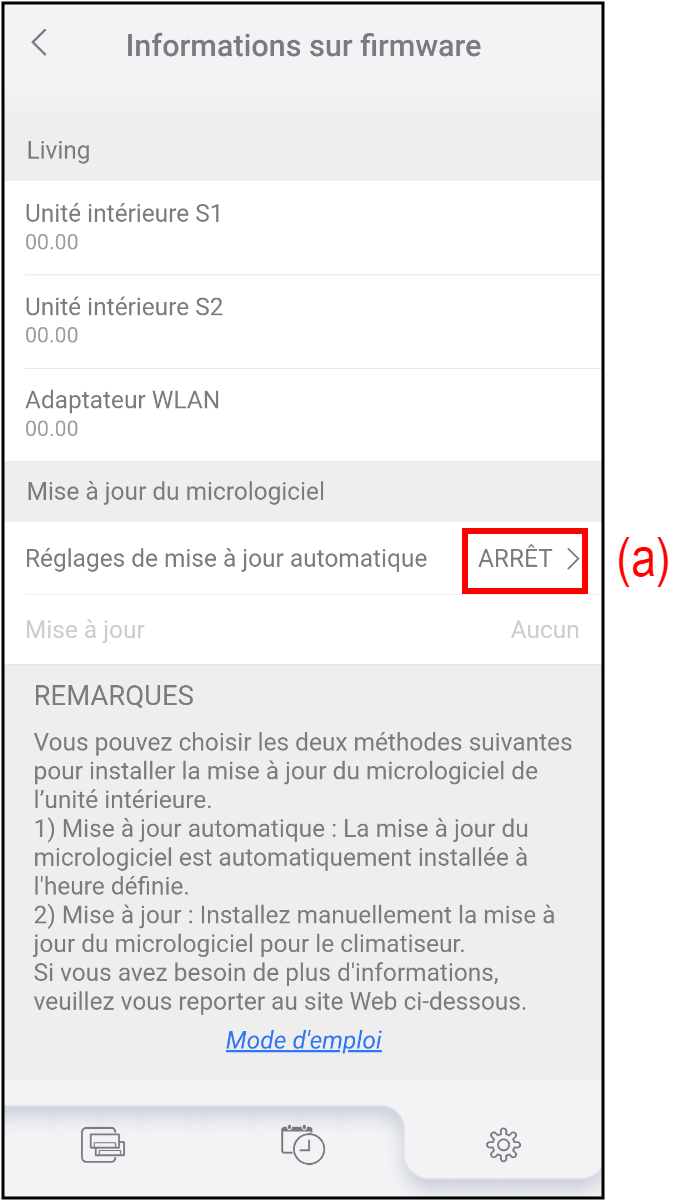 Vous pouvez configurer l'heure de démarrage de la mise à jour automatique du micrologiciel du climatiseur et de l'adaptateur WLAN.