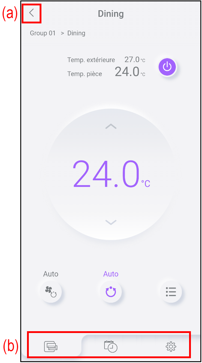 Vous pouvez vérifier l'état de fonctionnement des climatiseurs et les faire fonctionner à partir de cet onglet. Consultez « MENU D’ACCUEIL » et « Réglages des fonctions » pour plus de détails. * Lorsque le groupe est configuré, l'icône change. |