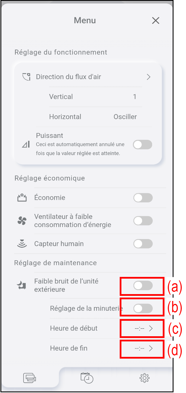 | (d) | Heure de fin | Appuyez pour configurer l'heure de fin de la minuterie à faible bruit de l'unité extérieure. Le faible bruit de l'unité extérieure s’arrête à l'heure configurée. |