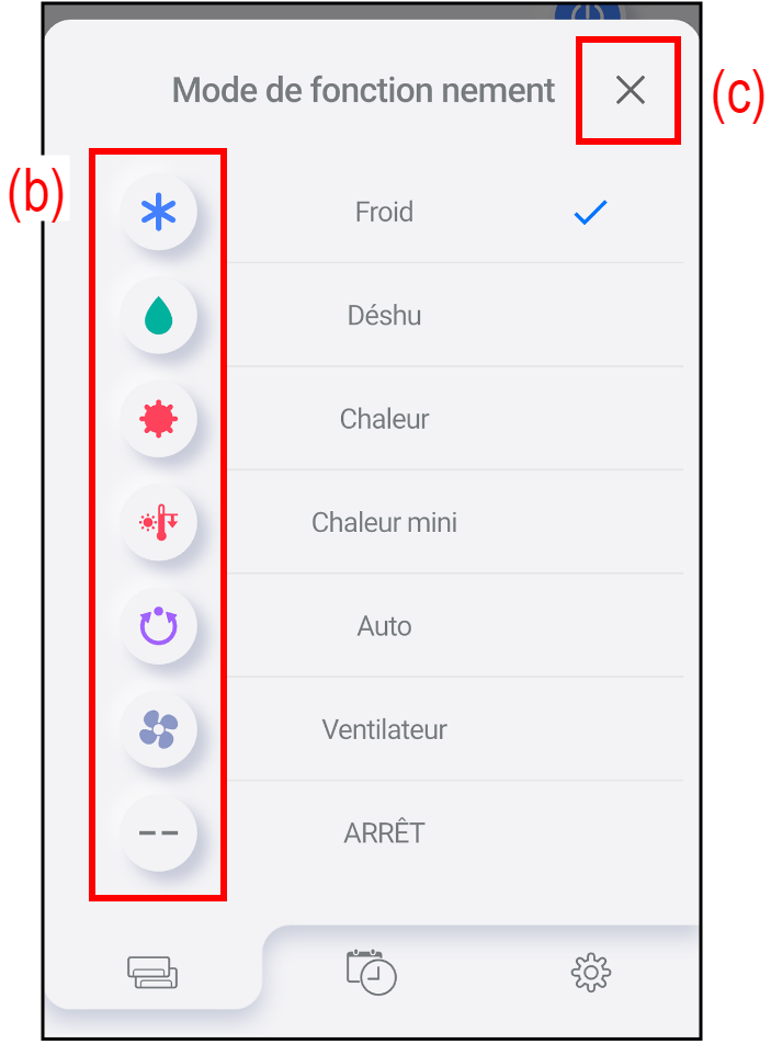 Appuyez sur l'icône (b) du mode de fonctionnement souhaité.