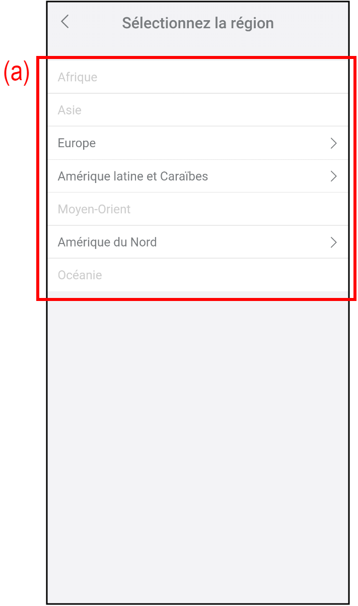 L’écran « Choisir Région » s’affiche. - Sélectionnez votre région dans la liste (a).