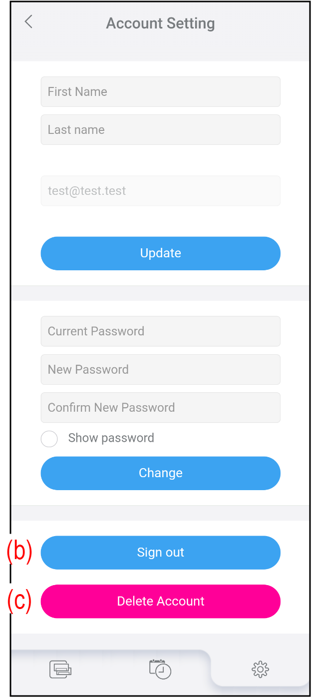 Za brisanje vašeg računa iz ove aplikacije i s poslužitelja AIRSTAGE Cloud, dodirnite gumb (c).