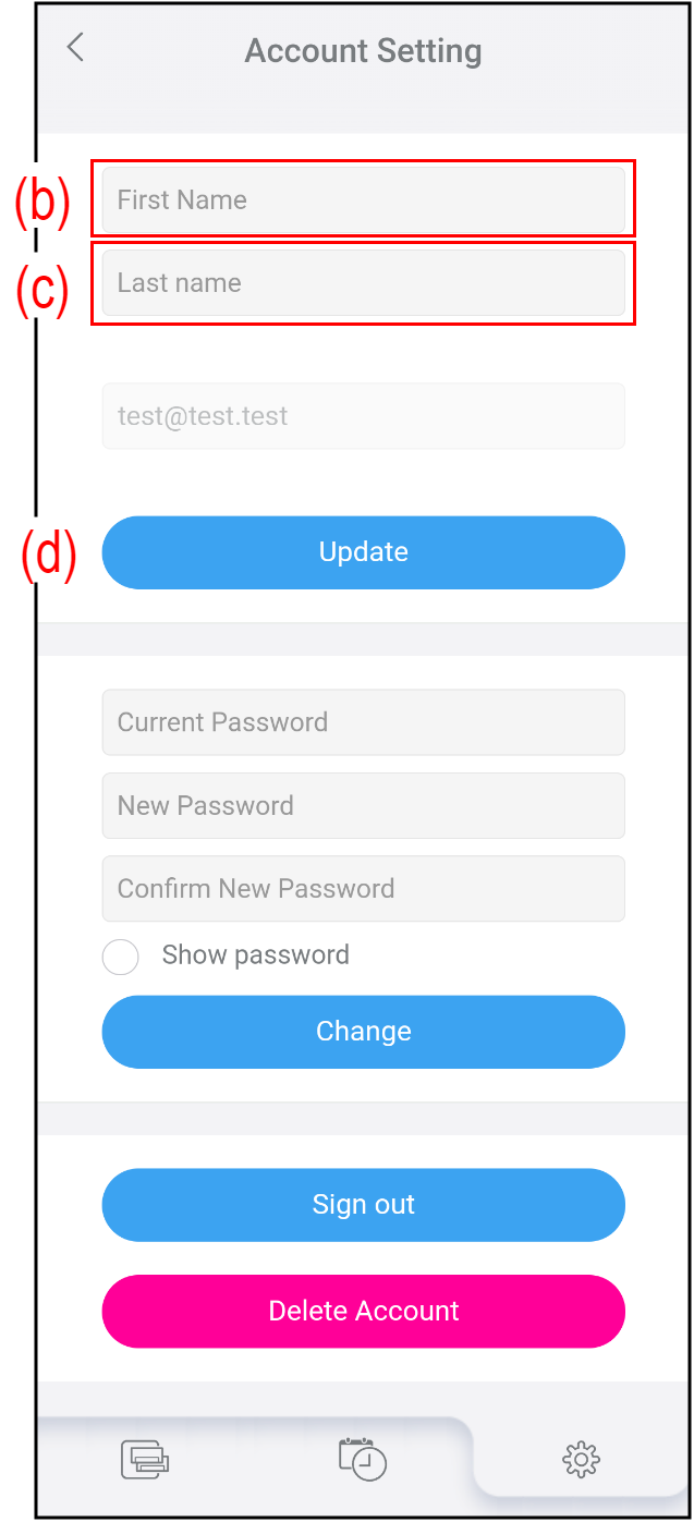 Dodirnite (a) na zaslonu „Setting“ za promjenu informacija o svom računu i lozinke.