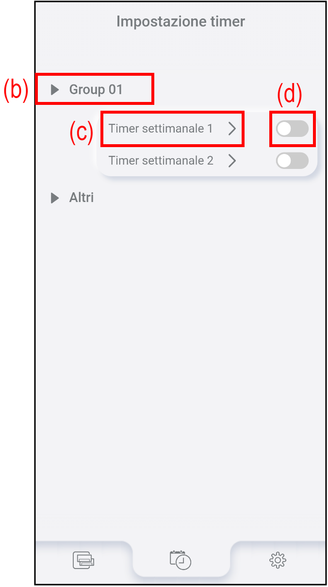 Toccare (d) per attivare/disattivare il Timer settimanale.