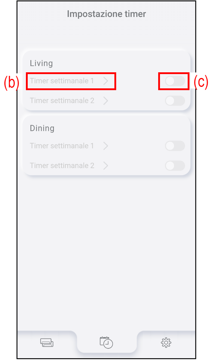 Toccare (c) per controllare o modificare le impostazioni del Timer settimanale. Fare riferimento a "Procedura di Impostazione Timer" per informazioni dettagliate.