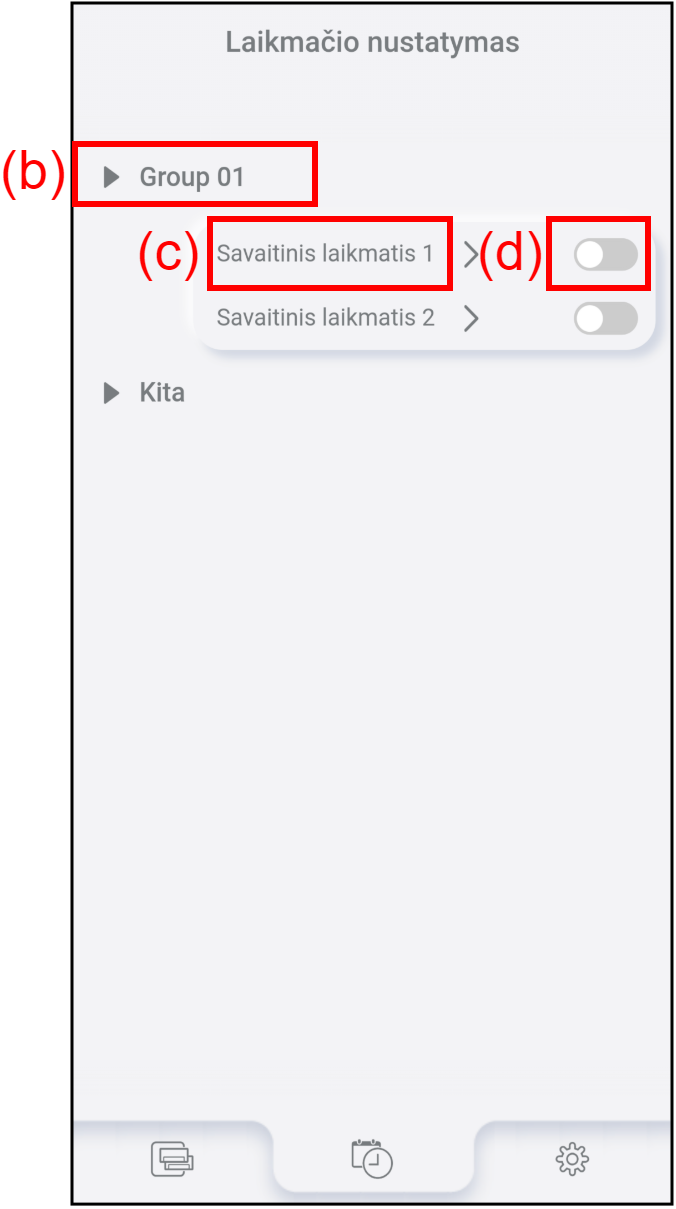 Norėdami patikrinti arba redaguoti savaitinio laikmačio nustatymus, bakstelėkite (c). Jei reikia daugiau informacijos, žr. „Laikmačio nustatymo procedūra“.