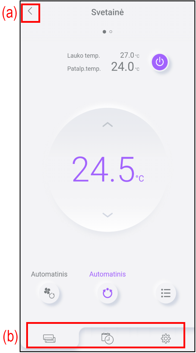 Nustatymų kortelė | Šioje kortelėje galite tikrinti ir keisti įvairius šios programėlės arba oro kondicionierių nustatymus. Jei reikia daugiau informacijos, žr. skiltį NUSTATYMAI. |