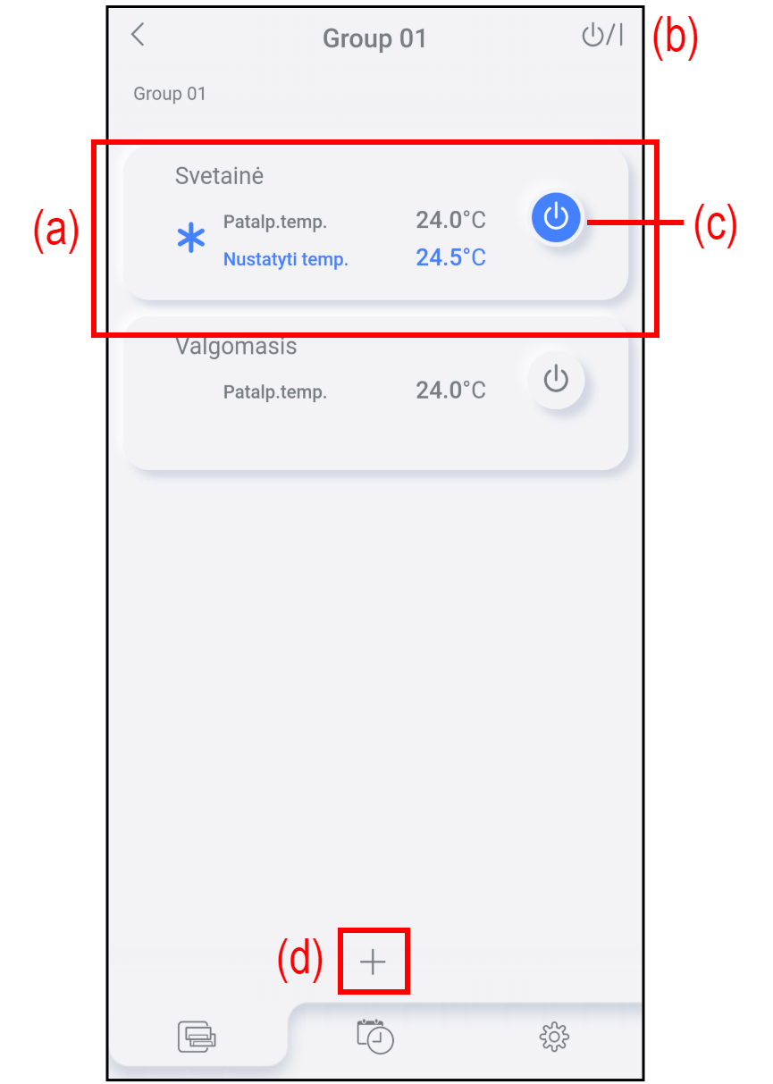 Norėdami užregistruoti naują oro kondicionierių, bakstelėkite (d). Jei reikia daugiau informacijos, žr. „ORO KONDICIONIERIAUS REGISTRAVIMAS“.