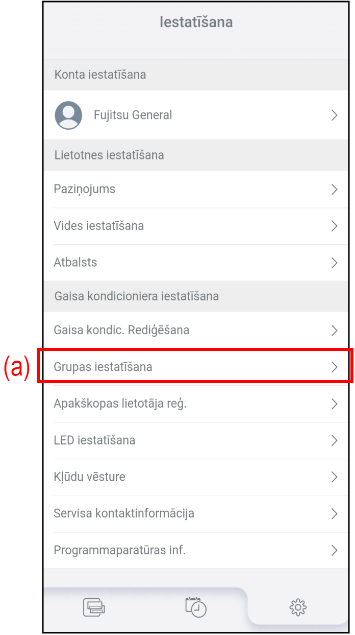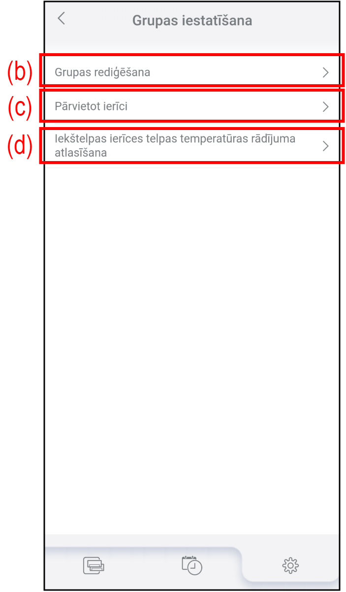 (b) Grupas rediģēšana Pieskarieties, lai izveidotu jaunu grupu, rediģētu grupas nosaukumu vai dzēstu grupu. Sīkāku informāciju skatiet sadaļā “Group editing (Grupas rediģēšana)”. (c) Pārvietot ierīci Pieskarieties, lai pārvietotu gaisa kondicionierus uz citu grupu.
