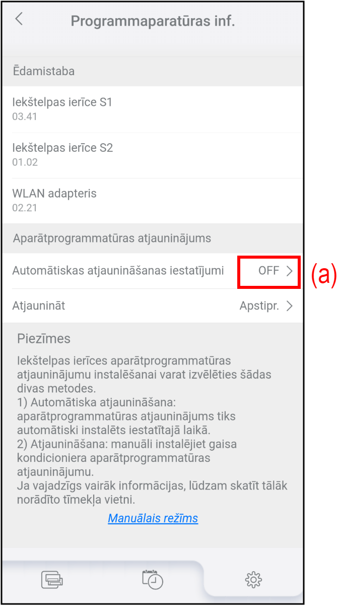 - Ekrānā “Programmaparatūras inf.” pieskarieties (a), lai rediģētu automātiskās programmaparatūras atjaunināšanas iestatījumus.