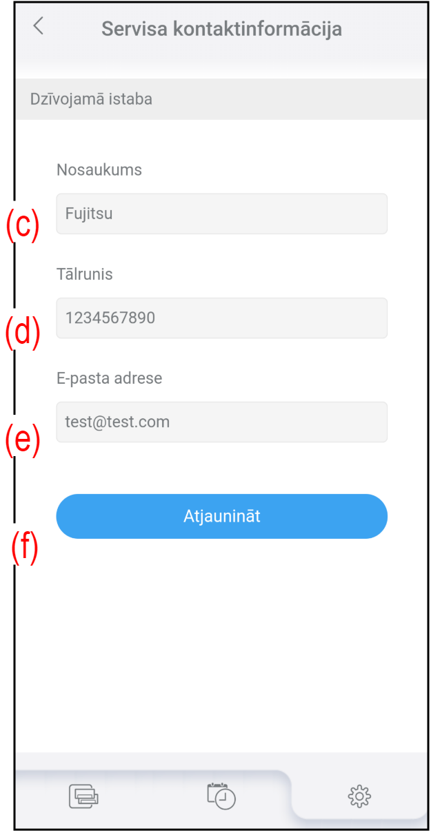 (d) Tālrunis Ievadiet servisa personāla vai uzņēmuma tālruņa numuru. (e) E-pasta adrese Ievadiet servisa personāla vai uzņēmuma e-pasta adresi.