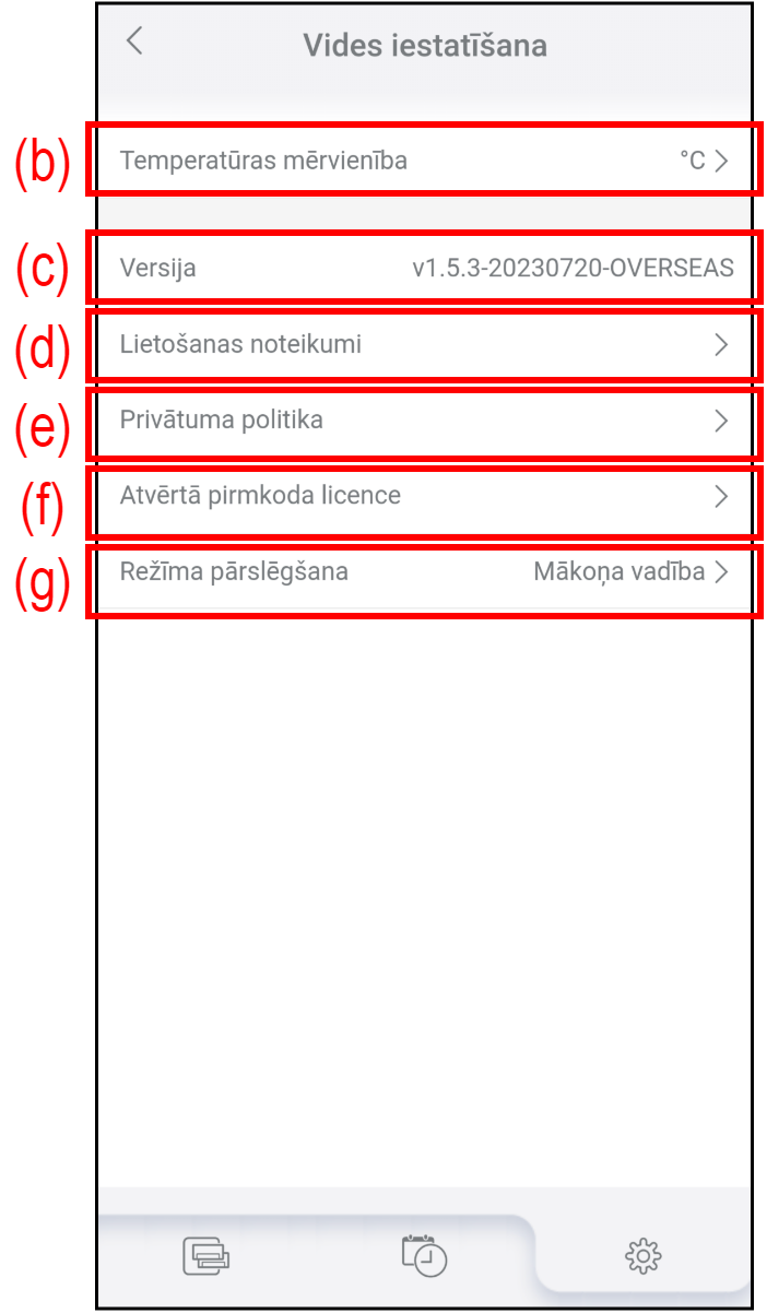 (b) Temperatūras mērvienība Pieskarieties, lai pārslēgtu šajā lietotnē rādīto temperatūras vienību (°C vai °F.)