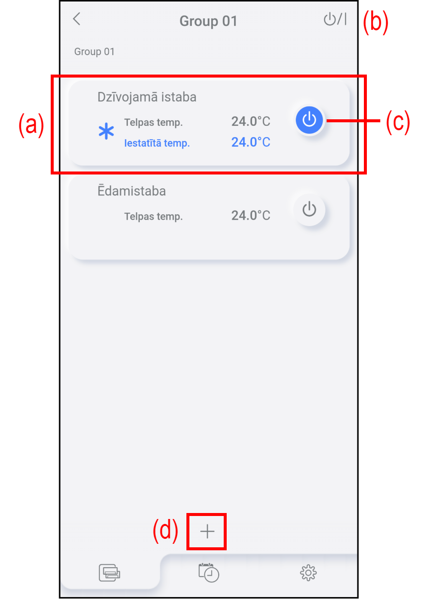 Pieskarieties (d), lai reģistrētu jaunu gaisa kondicionieri. Papildinformāciju skatiet sadaļā “GAISA KONDICIONIERA REĢISTRĀCIJA”.