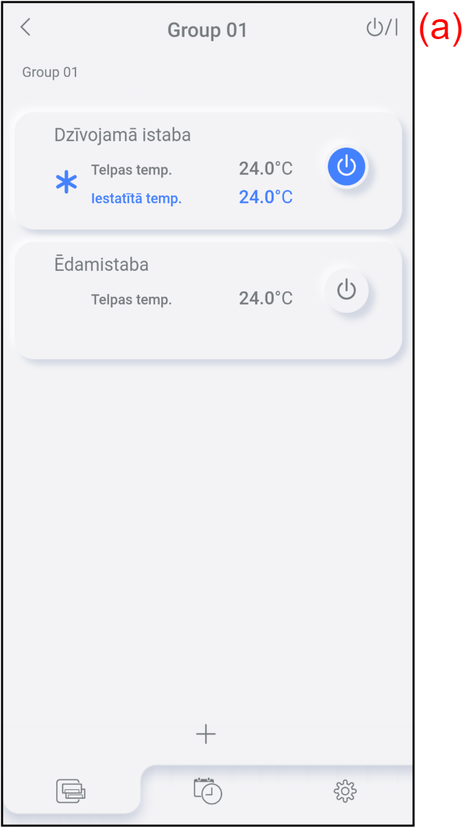 Pieskarieties (b), lai sāktu/apturētu visu grupas gaisa kondicionieru darbību. Papildinformāciju skatiet tālāk sadaļā “Visas sākšanas/apturēšanas darbības”.