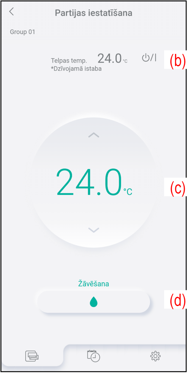 (b) Sākt/apturēt Lai sāktu/apturētu darbību, pieskarieties šeit. (c) Iestatīt temperatūru Lai mainītu iestatīto temperatūru, pieskarieties [