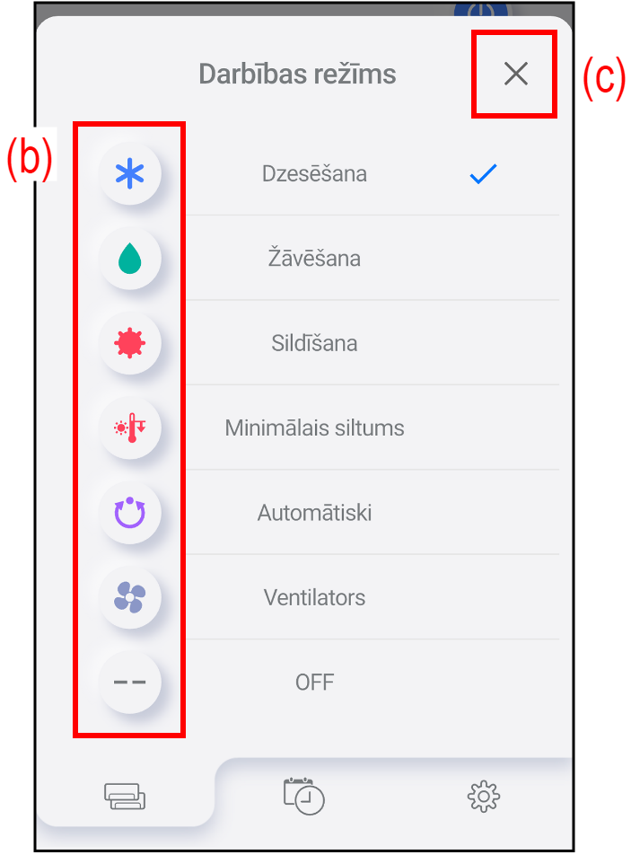 Pieskarieties vēlamā darbības režīma ikonai (b).