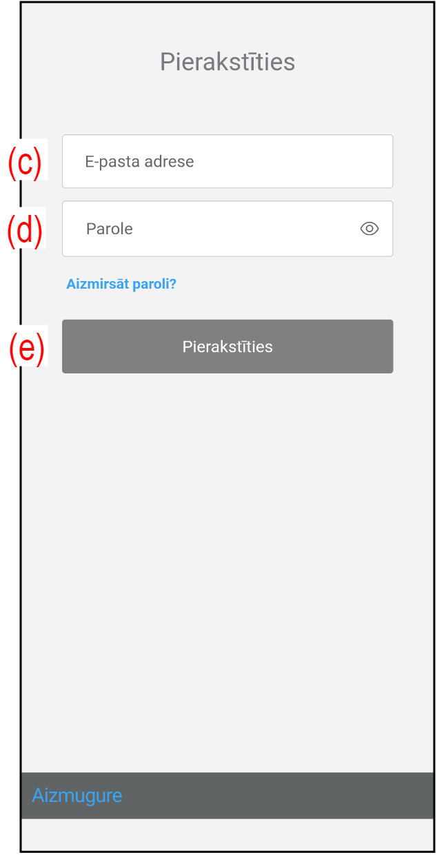 - Piesakieties, izmantojot e-pasta adresi (c) un paroli (d), ko reģistrējāt.