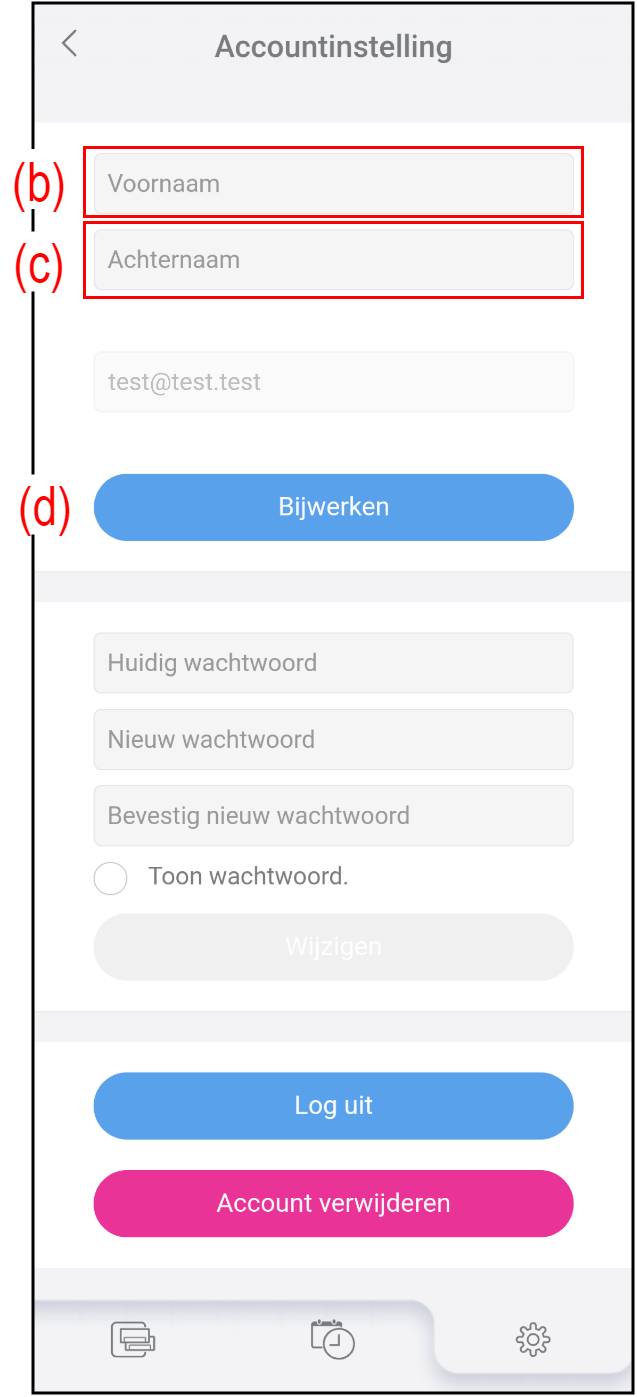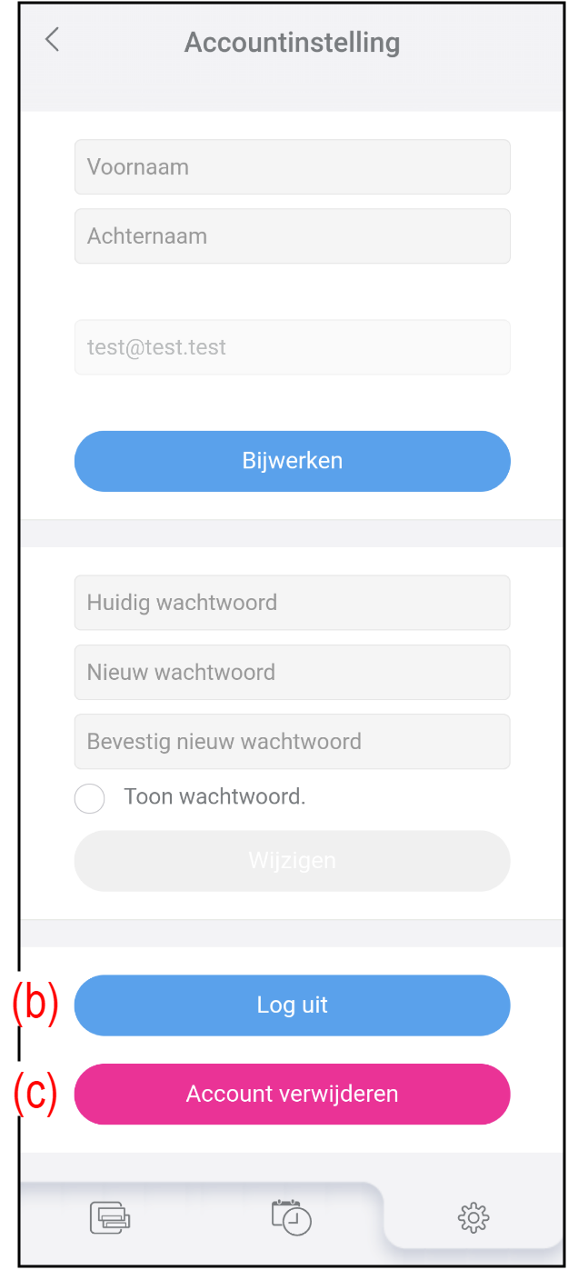 Tik op de knop (c) om uw account van deze app en AIRSTAGE Cloud-server te verwijderen.