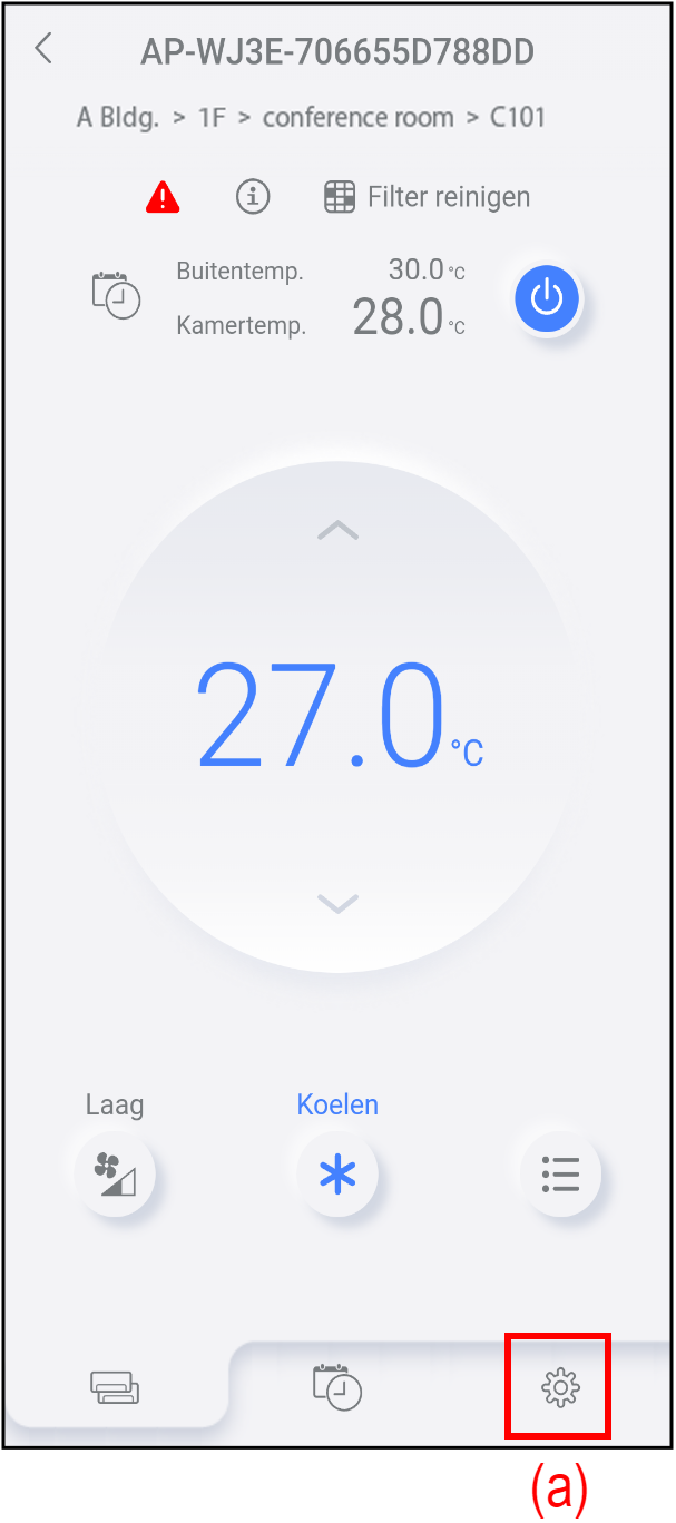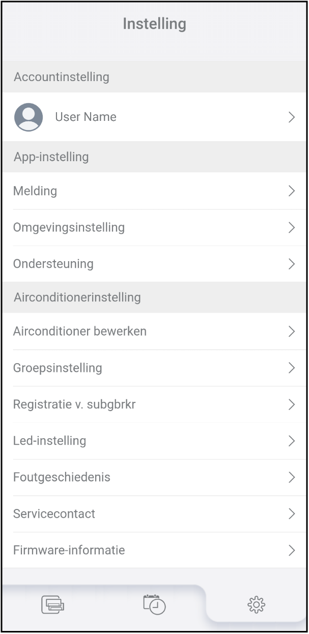 U kunt de verschillende instellingen voor deze app of de airconditioners controleren en wijzigen op het tabblad Instellingen [